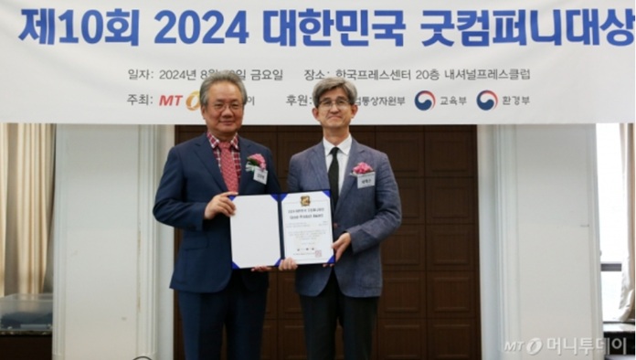 정양구 세렉스 대표(사진 오른쪽)가 23일 오후 서울 중구 한국프레스센터에서 열린 머니투데이 주최의 '2024 제10회 대한민국 굿컴퍼니대상' 시상식에서 '아이가드 라인디텍션 시스템'을 개발한 공로로 'AI 기반의 알고리즘 센싱기술 부문' 'Good-Product Award'(굿- 제품대상)를 수상한 뒤 강호병 머니투데이 대표와 기념 촬영 중이다.